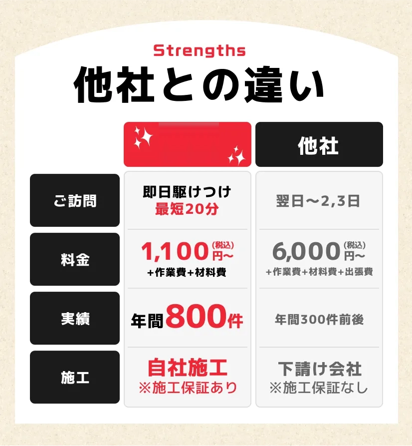 - 当社では保険への加入、無料の保証制度、3日以内の再発は無料修理を導入しています。